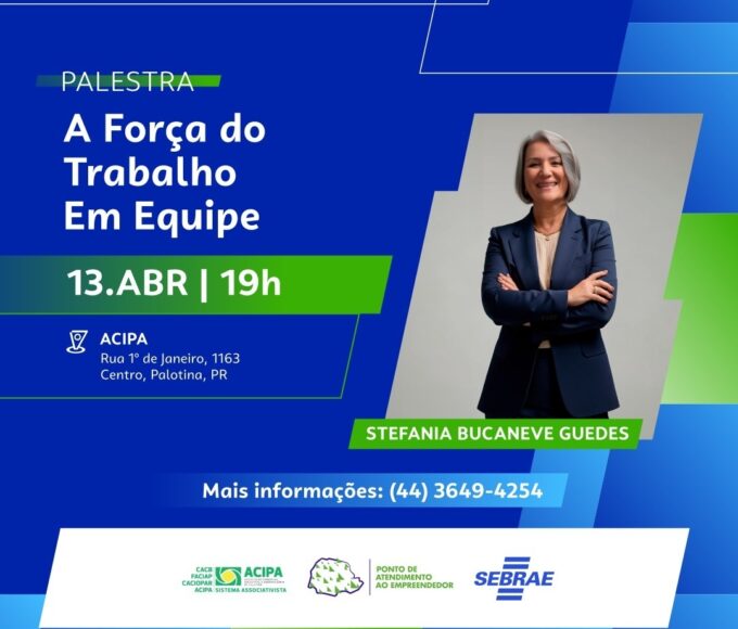 PorPalotina 24 Horas9 de abril de 2026A Associação Comercial, Industrial e Agropecuária de Palotina (ACIPA) promove no próximo dia 13 a palestra “A Força do Trabalho em Equipe”. O...