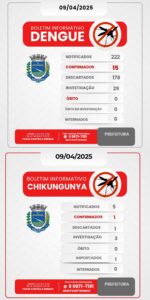 Segundo o boletim epidemiológico divulgado no dia 9 de abril, Palotina registra 15 casos confirmados de dengue e 1 caso de chikungunya. No total, foram 222 notificações de dengue, com 178 descartadas e 29 ainda em investigação. Já a chikungunya soma cinco notificações, com quatro descartadas e um caso confirmado — importado de outro município. Não há registros de internações ou óbitos.