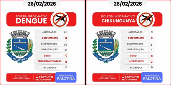 PorPalotina 24 Horas26 de fevereiro de 2026A Prefeitura de Palotina divulgou nesta quarta-feira (26) o boletim epidemiológico atualizado sobre os casos de dengue e chikungunya. Segundo o levantamento, o...