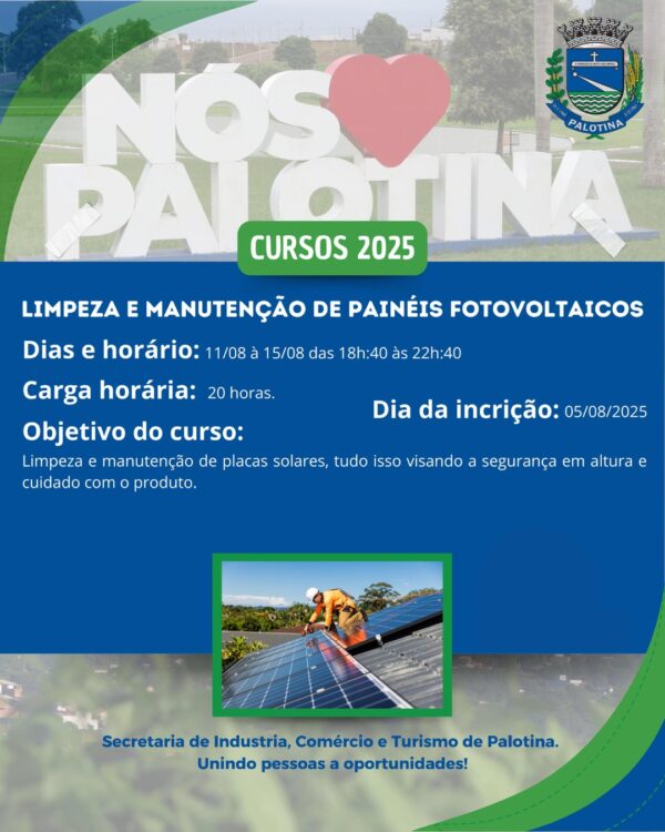PorPalotina 24 Horas6 de agosto de 2025OPORTUNIDADE – Estão abertas as inscrições para o curso gratuito de Limpeza e Manutenção de Painéis Fotovoltaicos em Palotina. A capacitação é promovida...