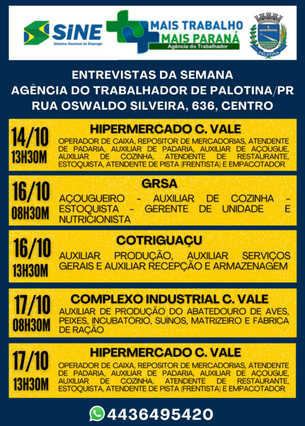 PorPalotina 24 Horas15 de outubro de 2024Palotina – A Agência do Trabalhador realiza nessa semana diversas entrevistas, para as mais variadas vagas de emprego. Segunda-feira (14) 13h30 – Entrevistas...