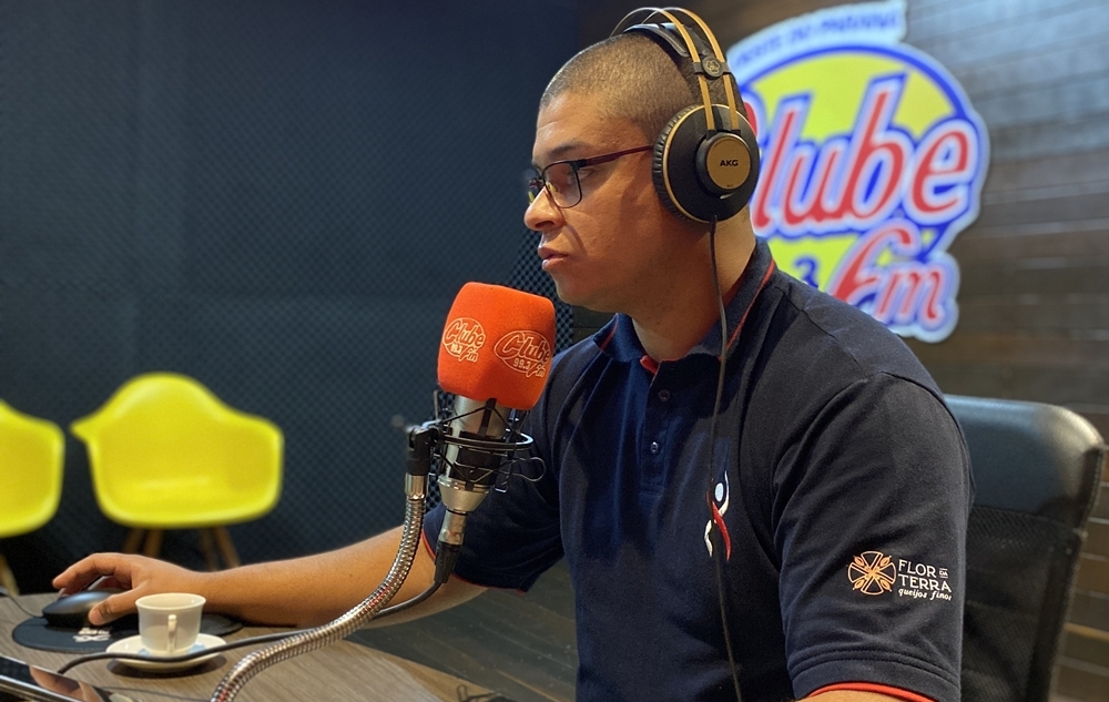Vladimir Marques no estúdio da Clube FM durante entrevista sobre os cursos do Biopark. Foto: Sara Pessoa