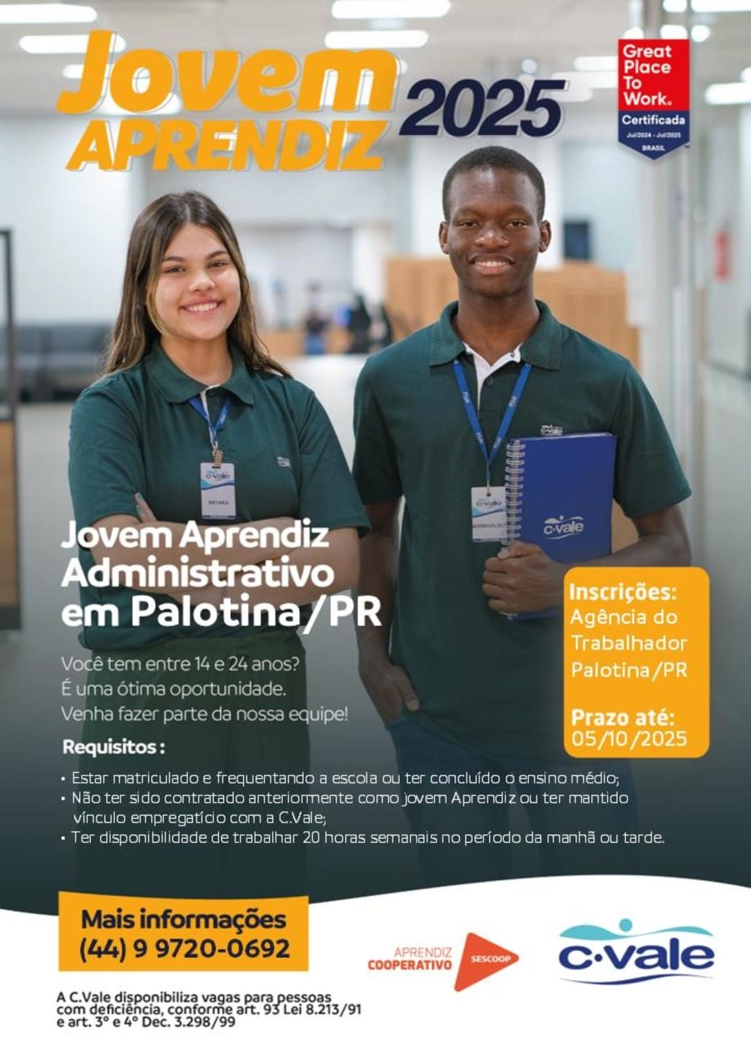 OPORTUNIDADE – A C.Vale está com inscrições abertas para o Jovem Aprendiz Administrativo, em Palotina. A iniciativa busca oferecer experiência profissional e qualificação a jovens que desejam ingressar no mercado de trabalho