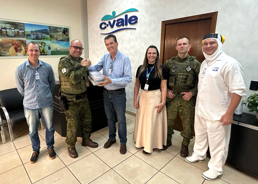 C.Vale – A equipe do abatedouro de aves da C.Vale doou um kit de treinamento especializado para os cães farejadores do BPFron (Batalhão de Polícia de Fronteira). A ação foi realizada no início do mês de abril.