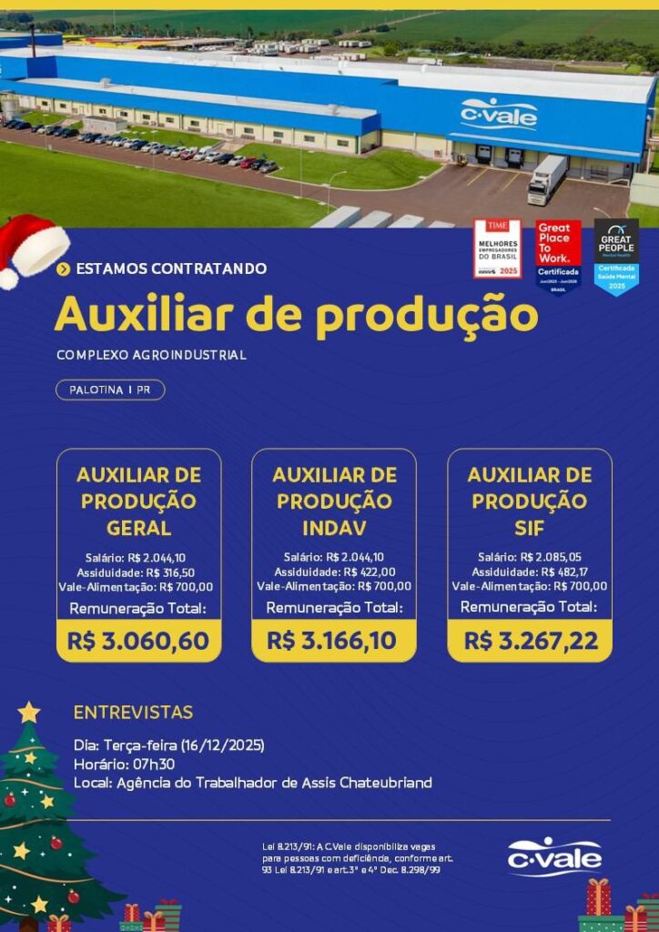 A C.Vale realiza, na próxima terça-feira (16), um processo seletivo com agenda especial de entrevistas para contratação de auxiliares de produção. As oportunidades são destinadas ao complexo agroindustrial da cooperativa em Palotina.