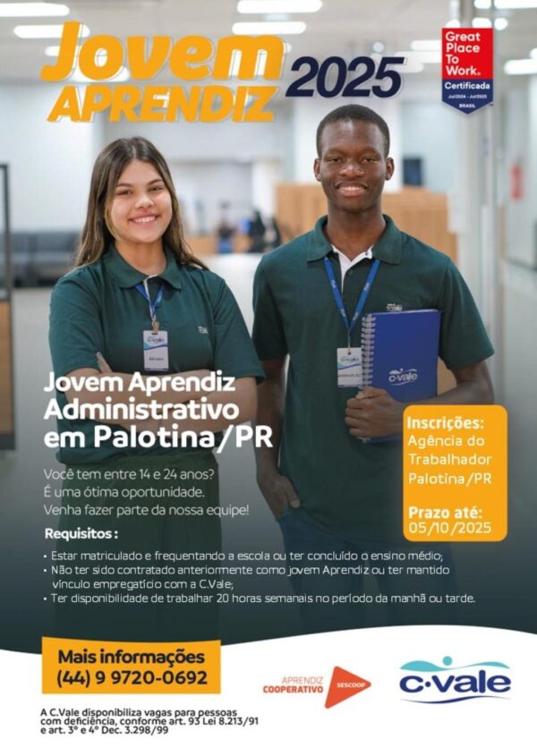 PorPalotina 24 Horas27 de setembro de 2025OPORTUNIDADE – A C.Vale está com inscrições abertas para o Jovem Aprendiz Administrativo, em Palotina. A iniciativa busca oferecer experiência profissional e qualificação...