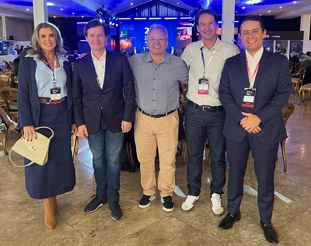 A foto oficial registra da esquerda para a direita: Cleo Redivo, Rogério Afonso (diretor financeiro da AERP), Walber Guimarães Junior (diretor administrativo da AERP), Cristiano Krames e Rodrigo Martinez, presidente da associação.