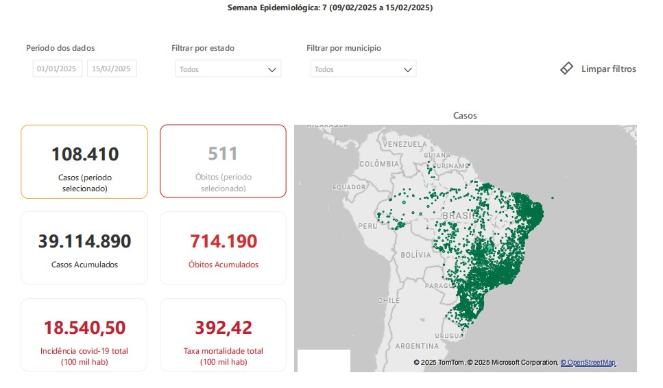 O Brasil registrou 108.410 novos casos de Covid-19 em 2025, considerando o período de 1° de janeiro a 15 de fevereiro. O intervalo corresponde às sete primeiras semanas epidemiológicas (SE) deste ano e representa uma alta de 52% ante os 71.479 registrados nas últimas sete semanas epidemiológicas de 2024, que engloba o período entre os dias 8 de novembro e 28 de dezembro. Os dados são do painel do Painel da Covid-19 no Brasil, do Ministério da Saúde.