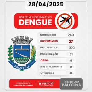 Segundo o último boletim divulgado, o município registra 27 casos confirmados de dengue, 260 notificações e 31 casos ainda em investigação. Embora o número de confirmações esteja relativamente controlado, o volume de notificações preocupa as autoridades de saúde.