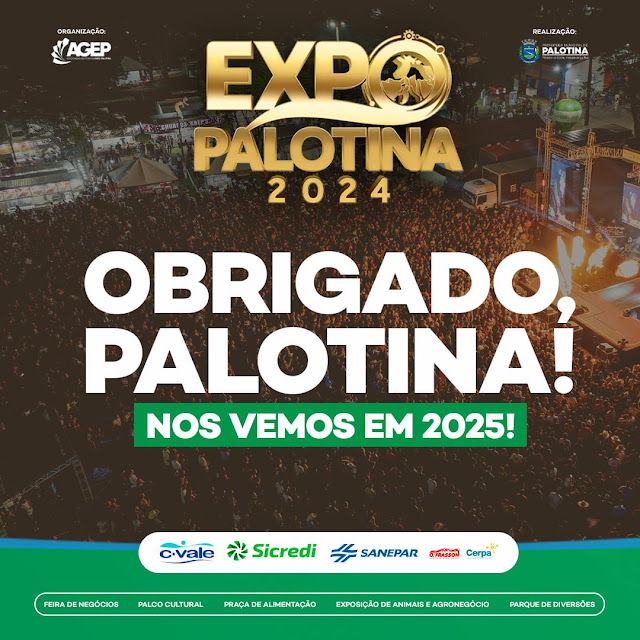 O presidente da Agep, fez questão de fazer um agradecimento especial aos patrocinadores da Expo Palotina 2024: C.Vale, Sicredi, Sanepar, O. Frasson e a Cerpa. “Todo o Nosso reconhecimento e agradecimento também a diretoria e colaboradores da Acipa e todos os integrantes da Agep, sem a dedicação e forço de cada um, a Expo Palotina 2024 não teria o brilho e o sucesso que teve. Obrigado Palotina e até a Expo Palotina 2025”, ressalta Eduardo.