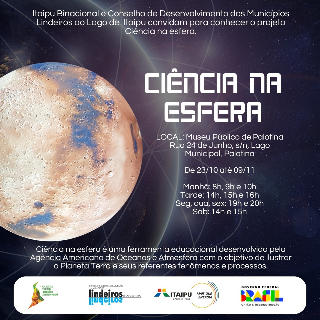 Palotina – A cidade de Palotina se prepara para receber uma atração única e inovadora: o “Ciência na Esfera” (Science On a Sphere®), que será realizado no Museu Municipal de 23 de outubro a 9 de novembro. Promovido pela Itaipu Binacional, Conselho de Desenvolvimento dos Municípios Lindeiros ao Lago de Itaipu e pela Secretaria Municipal de Educação e Cultura, o evento promete transformar a forma como os visitantes compreendem os fenômenos do nosso planeta.