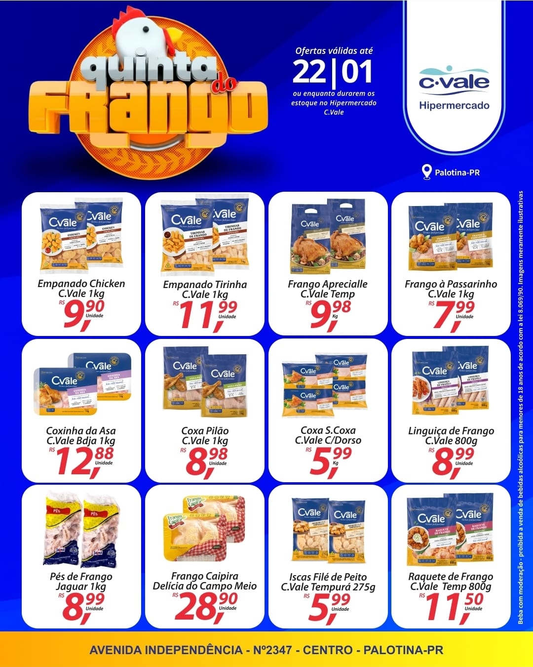 O Hipermercado C.Vale de Palotina atende até o meio-dia nesta quinta-feira (22), em razão do feriado municipal. O restaurante abre às 11h30 e funciona até as 13h30.