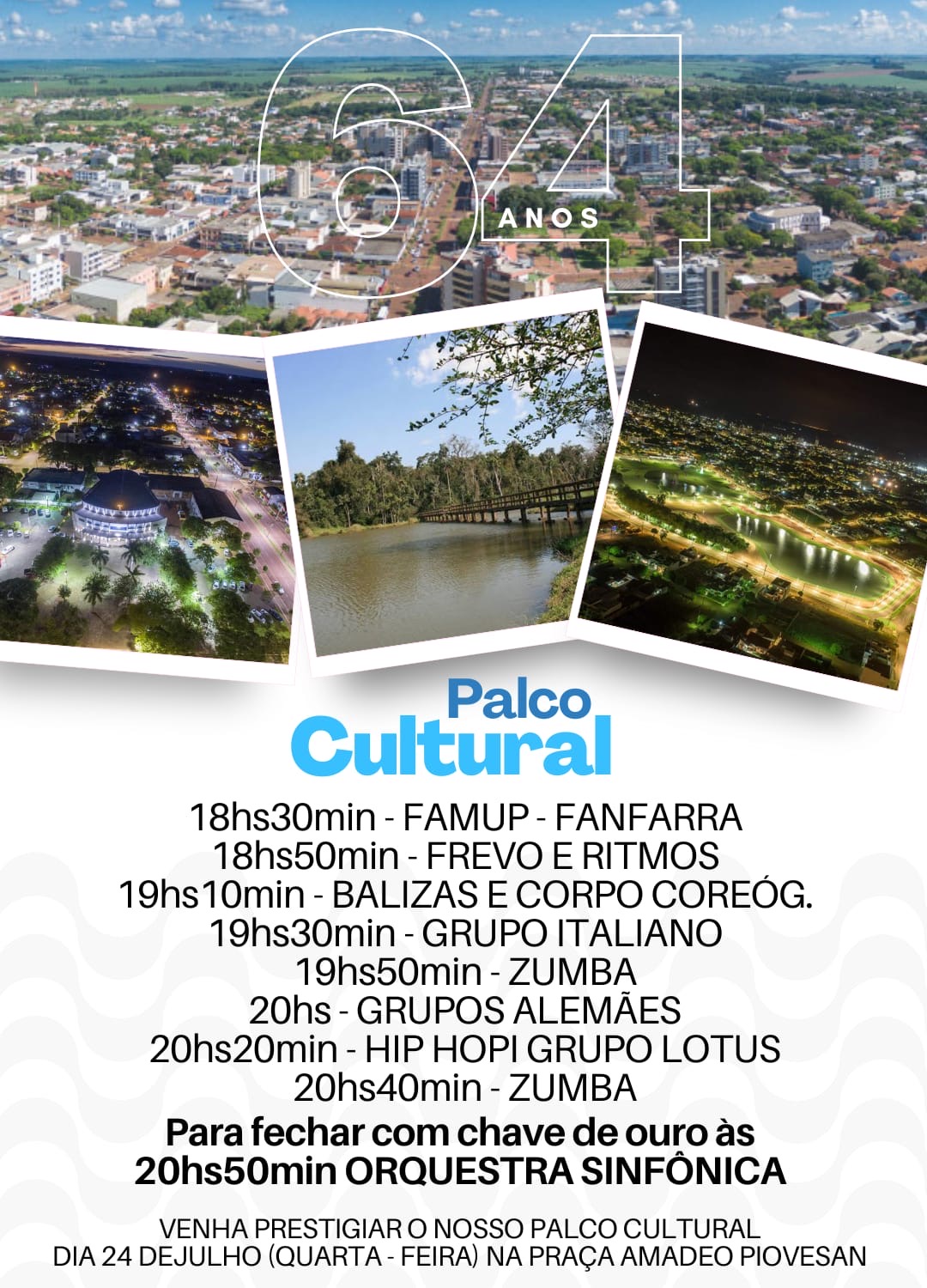Palco Cultural – O evento vai marcar a passagem dos 64 anos de emancipação político-administrativa de Palotina, que é comemorado no dia 25 de julho. O Palco Cultural, acontece nessa quarta-feira (24), a partir das 18h30, na Praça Amadeo Piovesan.