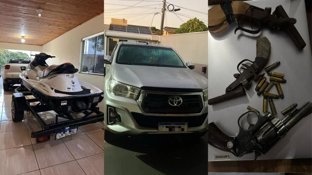 Durante a operação, os agentes apreenderam documentos, aparelhos eletrônicos, veículos, embarcações, armas de fogo, gado e outros bens de valor. Dois suspeitos foram presos em flagrante por posse ilegal de arma de fogo.