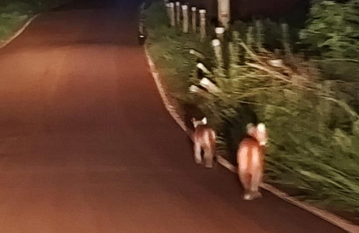 PALOTINA – Duas onças-pardas foram flagradas caminhando tranquilamente em uma estrada que liga o bairro São Mateus ao Parque Industrial de Palotina, nas proximidades da estação de tratamento de esgoto da Sanepar.