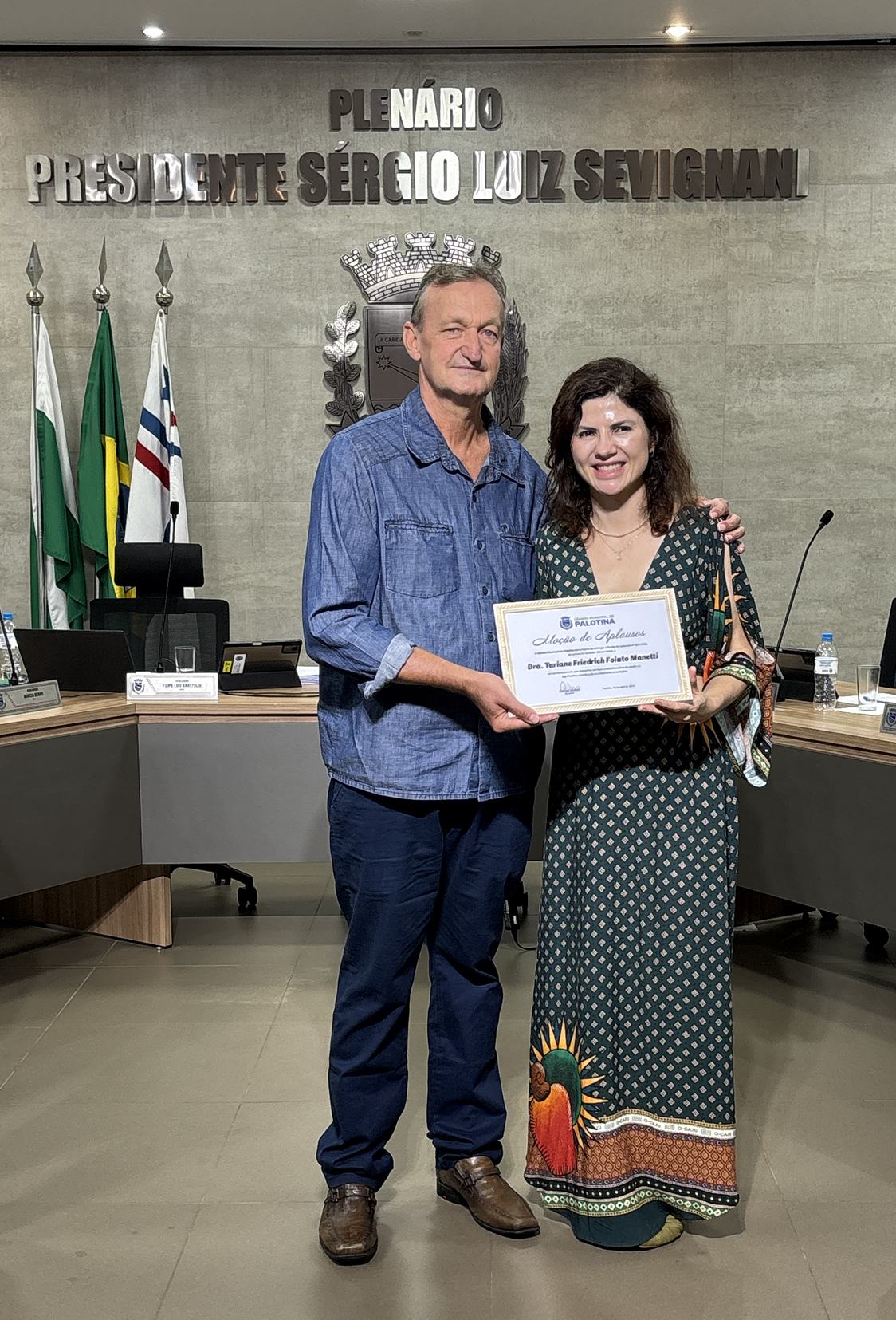 A médica esteve presente na sessão e recebeu a homenagem após o encerramento dos trabalhos, quando também foram feitos registros com vereadores e participantes.