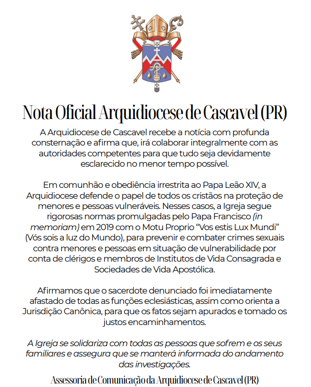 A Arquidiocese declarou seguir as normas estabelecidas pelo Papa Francisco, em 2019, para prevenir e combater crimes sexuais cometidos por clérigos contra menores e pessoas vulneráveis.