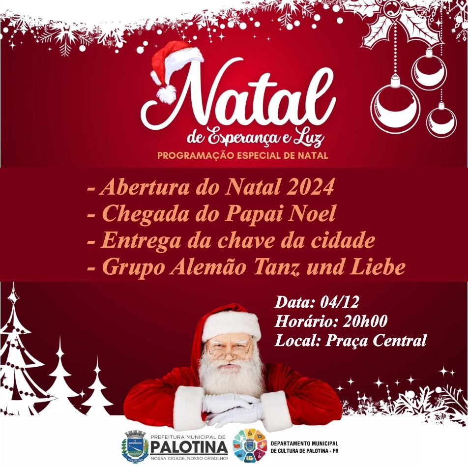 Palotina – Na próxima quarta-feira, dia 04 de dezembro, Palotina dará início à sua programação de Natal com a abertura oficial da programação ‘Natal de Esperança e Luz’. A cerimônia será realizada na praça central da cidade, a partir das 20h00, e promete encantar a comunidade com uma série de atrações. A chegada do Papai Noel marcará o início das festividades, trazendo alegria e magia ao coração dos palotinenses. Durante o evento, haverá também a entrega simbólica da chave da cidade, um gesto que representa a esperança e a união da população neste período natalino.