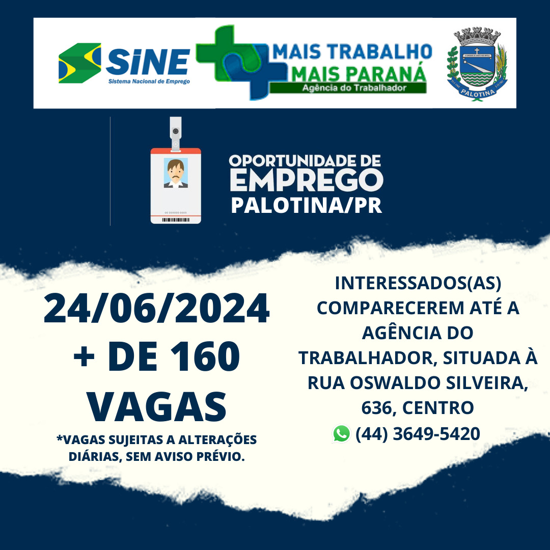 A Agência do Trabalhador de Palotina está com mais de 160 oportunidades disponíveis essa semana. Os interessados devem se dirigir a Agência Rua Dr. Osvaldo Silveira, 636 – Centro, munidos de documento com foto para fazer a inscrição. (VAGAS SUJEITAS A ALTERAÇÕES DIÁRIAS SEM AVISO PRÉVIO)