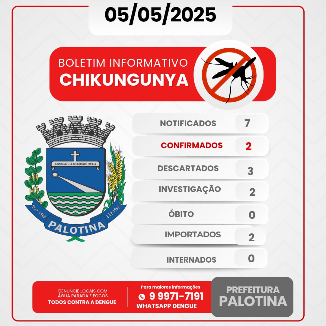 Saúde – A Secretaria Municipal de Saúde de Palotina, por meio da Coordenação de Endemias, confirmou o segundo caso de chikungunya no município. Trata-se de um caso importado: o paciente esteve recentemente em outro estado e retornou à cidade apresentando sintomas compatíveis com a doença.