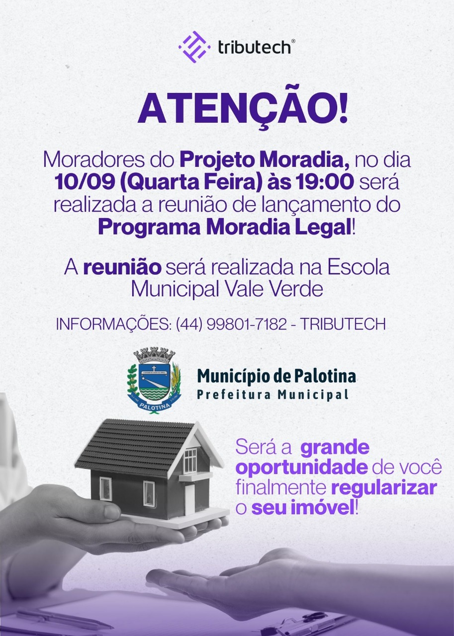 PALOTINA – O Município de Palotina, em parceria com a empresa Tributech, realizará nesta quarta-feira (10), às 19h, a reunião de lançamento do Programa Moradia Legal. O encontro será realizado na Escola Municipal Vale Verde e é direcionado aos moradores do Projeto Moradia.