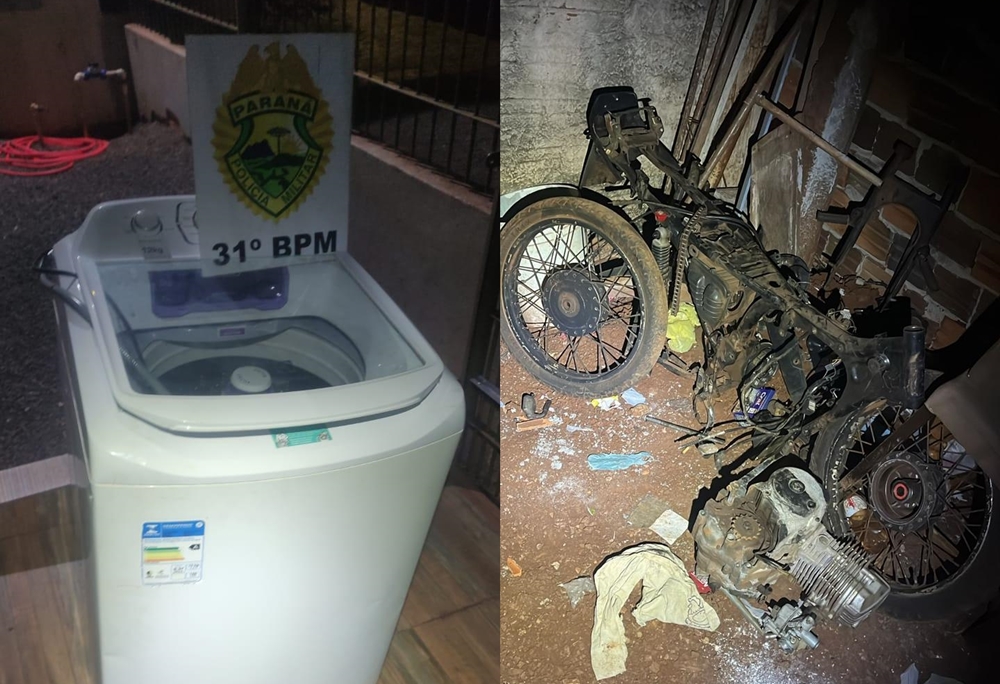 Com essas informações, a polícia localizou o segundo suspeito, que teria deixado a máquina de lavar. Na casa dele, foram encontradas duas motocicletas no quintal: uma desmontada, Honda CG Cargo 125, furtada em Assis Chateaubriand em 11/08/2024, e uma Honda CG 125 Fan, com o chassi suprimido.