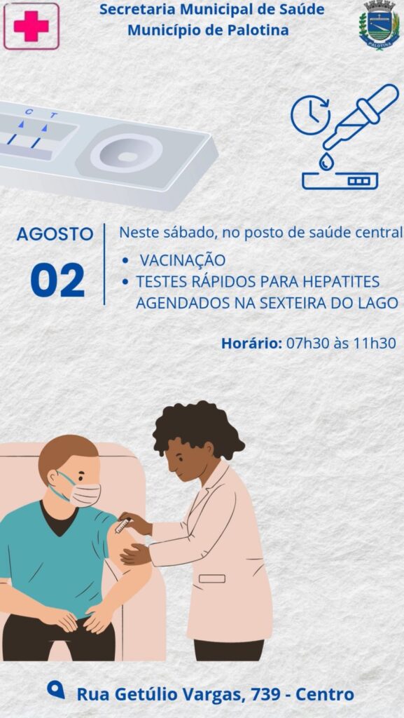 Saúde – A Secretaria Municipal de Saúde de Palotina realizará, neste sábado (2), uma ação especial no Posto de Saúde Central, com foco em vacinação e prevenção às hepatites virais. O atendimento acontecerá das 7h30 às 11h30.
