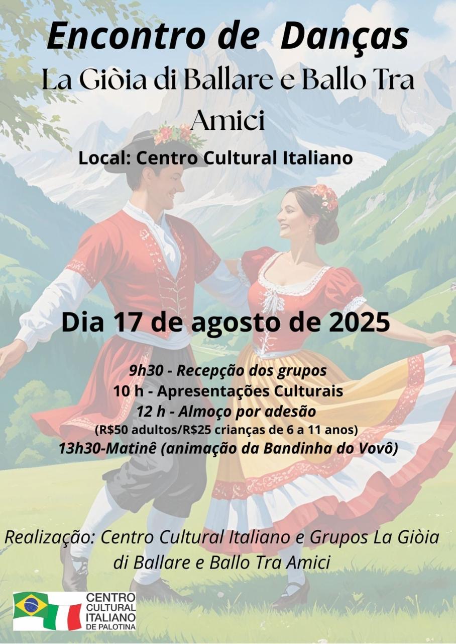 CULTURA – Neste domingo (17), o município de Palotina será palco de um Encontro de Danças, organizado pelos grupos de tradição italiana La Giòia di Ballare e Ballo Tra Amici.