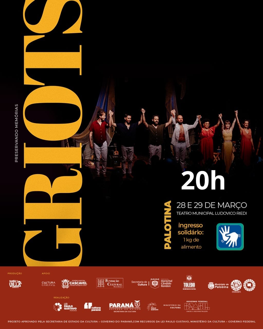 Cultura – Nos próximos dias 28 e 29, Palotina receberá uma apresentação de música e teatro, com circulação paranaense. O espetáculo Griots será apresentado às 20h, no Teatro Municipal Ludovico Riedi, com apoio do Departamento Municipal de Cultura. O ingresso será um quilo de alimento não perecível.