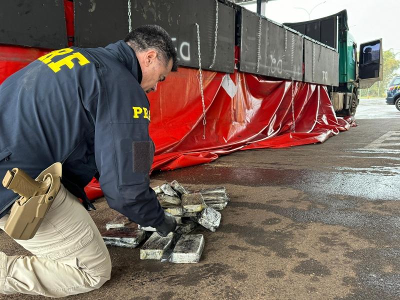 Os policiais realizaram a fiscalização no compartimento de carga da carreta, onde localizaram os tabletes da droga acomodados em diversos compartimentos ocultos.