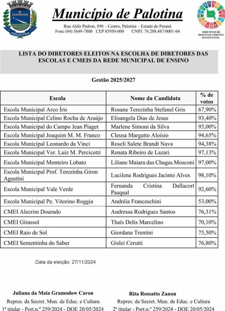 Palotina – A Prefeitura Municipal de Palotina divulgou, por meio do edital nº 106/2024, a lista oficial com os nomes dos diretores eleitos para as Escolas e Centros Municipais de Educação Infantil (CMEIs) do município. O pleito, que ocorreu no dia 27 de novembro de 2024, seguiu as diretrizes estabelecidas pela Lei Municipal 6.198, de 6 de setembro de 2022, que regulamenta a escolha democrática dos gestores escolares das instituições de ensino da rede municipal. A nova gestão, que será composta por diretores eleitos por suas respectivas comunidades escolares, terá um mandato que se estenderá de 1º de janeiro de 2025 até 31 de dezembro de 2027. A nomeação oficial dos eleitos será realizada por meio de uma Portaria a ser publicada no diário oficial do município ainda neste mês de dezembro.