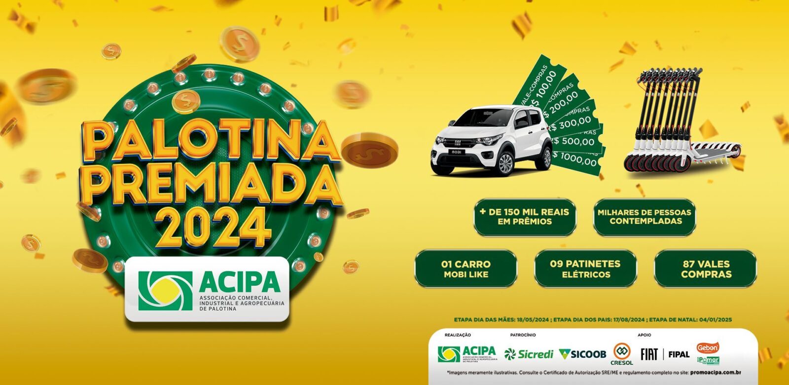A Promoção Palotina Premiada é uma realização da Acipa e terá ainda a etapa de Natal com sorteio de 12 vales compras de R$ 200,00, R$ 300,00 e R$ 500,00, totalizando 36 vales compras. Também serão sorteados 5 vales compras de R$ 1.000,00, um Fiat Mobi 0 km e cinco patinetes elétricos.