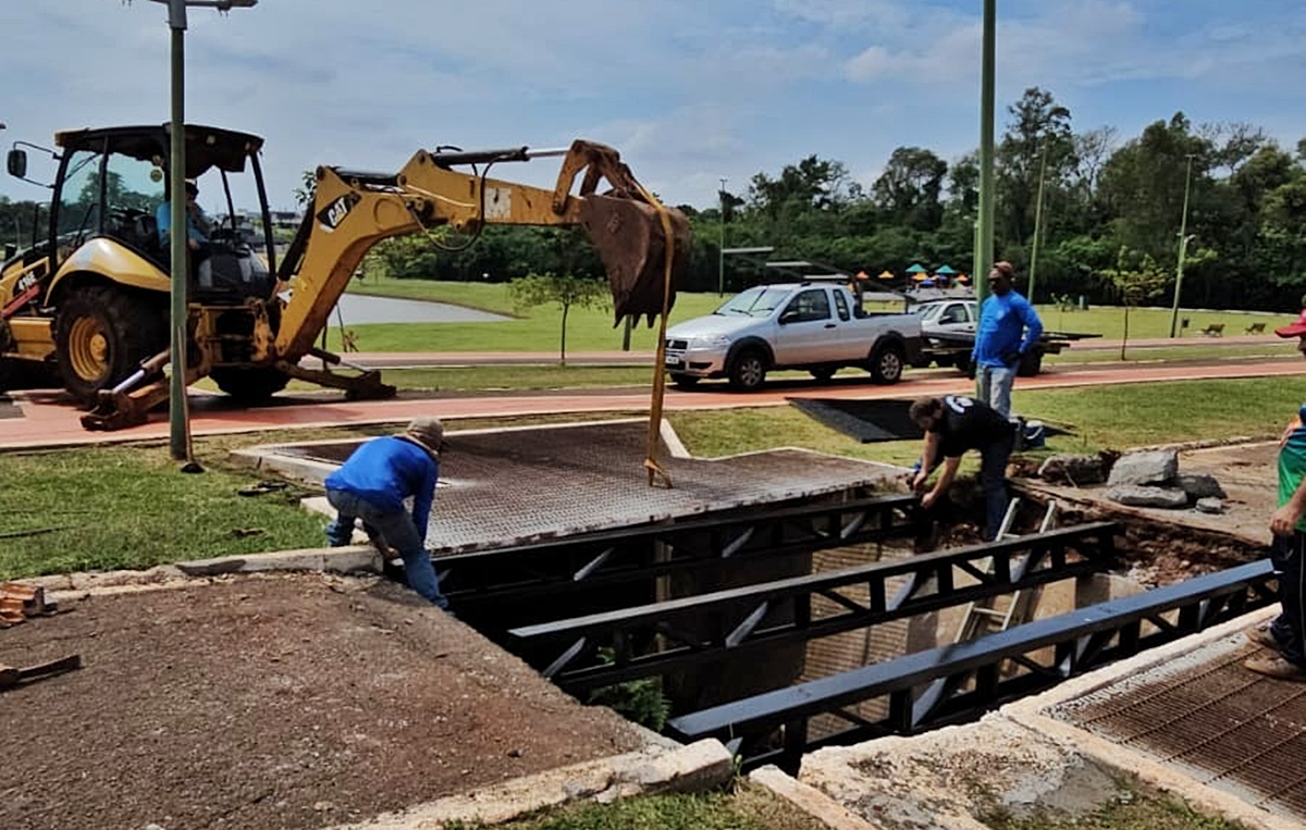 PAISAGISMO – A Prefeitura de Palotina, por meio da Secretara de Transportes e Obras Públicas, realizou a substituição do piso da ponte do Lago Municipal, como parte de uma intervenção emergencial. As antigas peças de madeira, que já apresentavam risco à segurança dos usuários, foram substituídas por uma nova estrutura metálica treliçada, que oferece maior resistência, durabilidade e segurança.